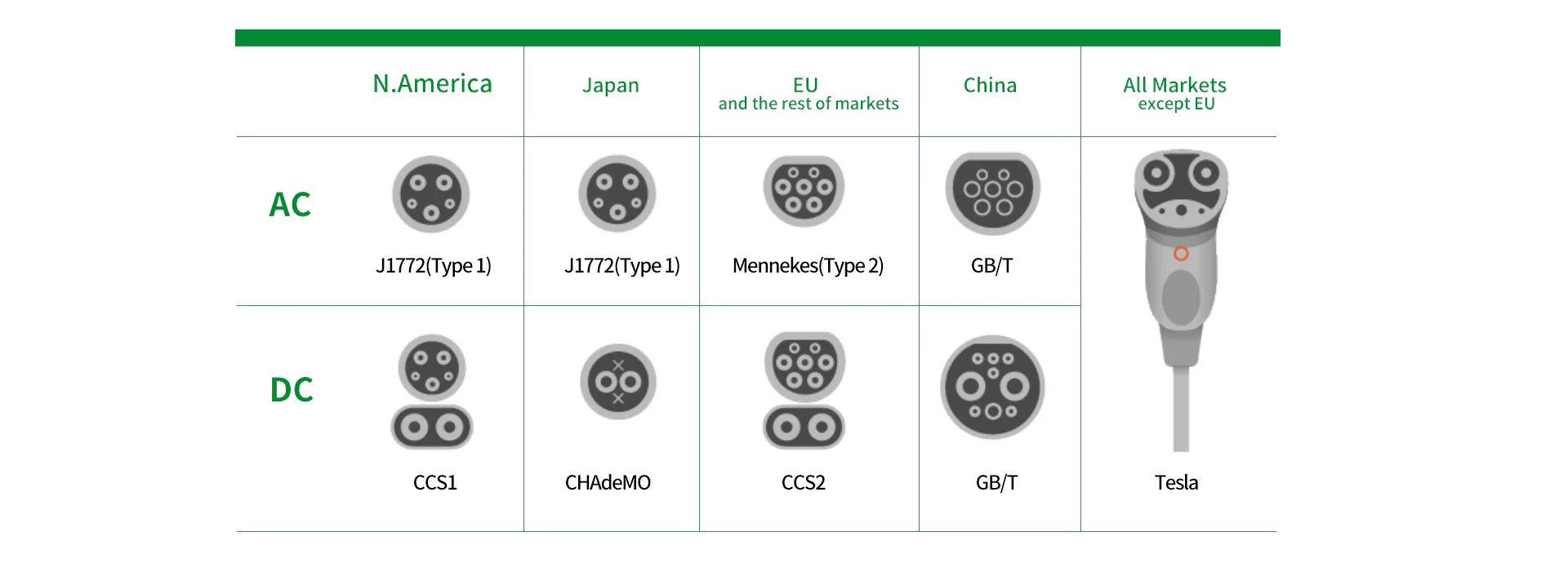 และพอร์ตสำหรับปกติแบบ DC 5 แบบ, CCS 1, CHAdeMO, CCS2, GB/T และพอร์ตมาตรฐาน Tesla.